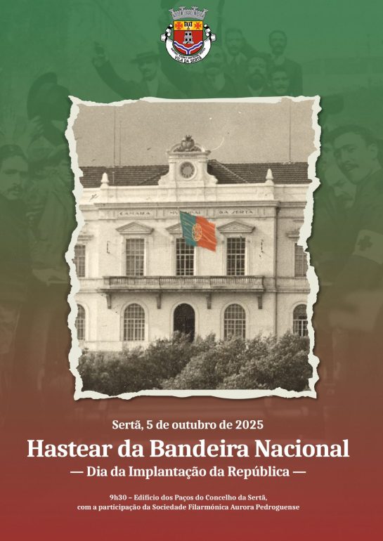 De forma a assinalar o Feriado Nacional da 5 de outubro, Dia da Implantação da República, decorrerá o Hastear da Bandeira Nacional no Edifício dos Paços do Concelho da Sertã. A cerimónia inicia-se às 9h30 e contará com a participação da Sociedade Filarmónica Aurora Pedroguense.