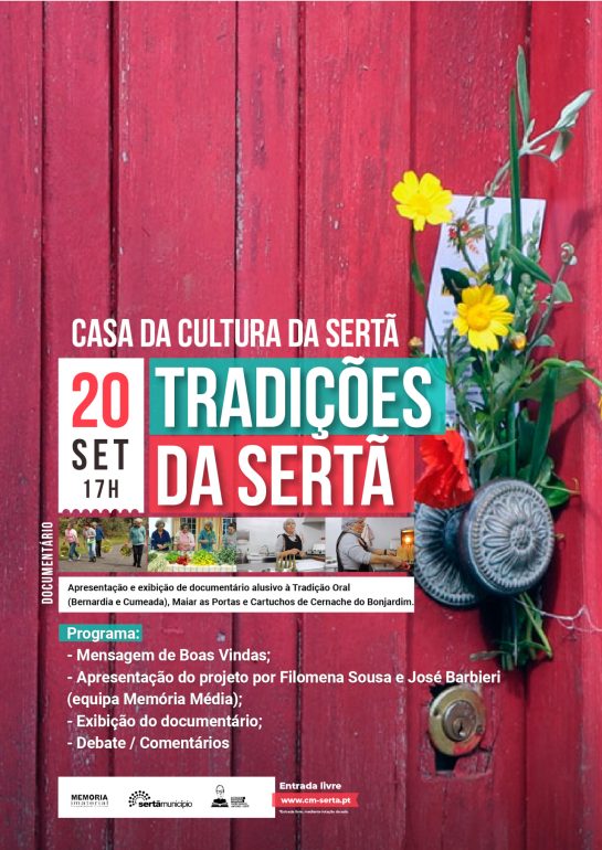 Produzido pela Memória Média com o apoio do Município da Sertã, este registo audiovisual das tradições sertaginenses surge no seguimento de documentários anteriores alusivos aos Coscoréis, Bonecas de Palhais e Produção de Medronho. A exibição deste documentário, a 20 de setembro na Casa da Cultura da Sertã, será precedida pela mensagem de boas-vindas de Carlos Miranda, presidente da Câmara Municipal da Sertã, seguindo-se a apresentação do projeto por Filomena Sousa e José Barbieri. A entrada é livre, mediante lotação da sala.